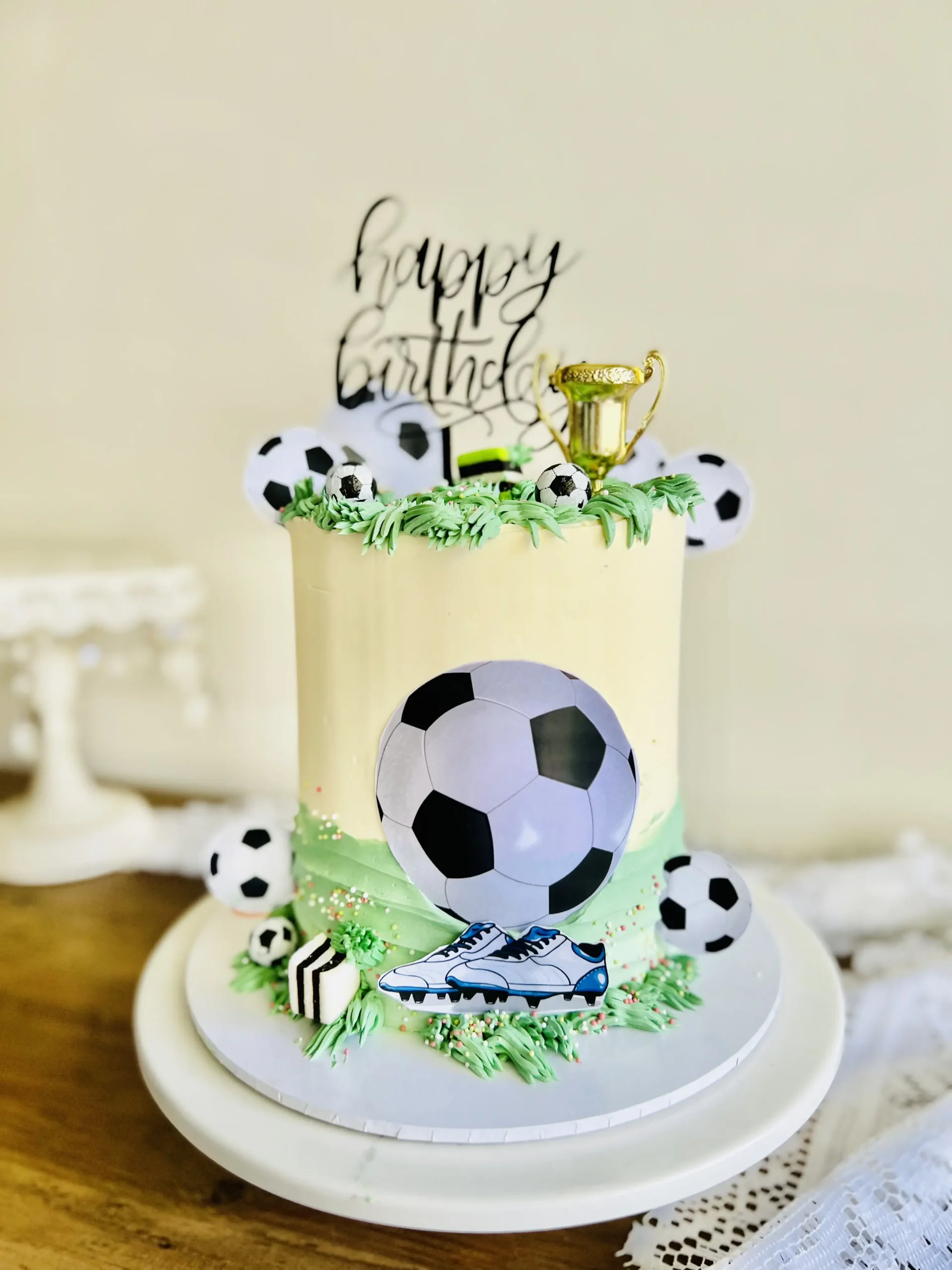 Our custom soccer cakes range in price depending on how many tiers you want and the size. Custom cakes start at $160 for a tall one tier cake to over $1,200 for a four tier cake.